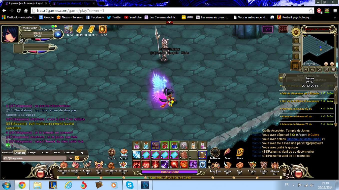 Je suis devant Camille l'aventurière pour entrer dans le temple de jones et vers la fin du chargement de la carte, je vois la fenêtre de mort (avec résurrection sur place, résurrection en ville, accepter la résurrection) la carte ayant fini de charger je me vois mort sans possibilités de faire une résurrection voilà c'est tout ^^