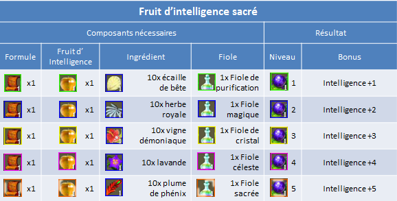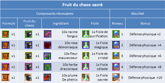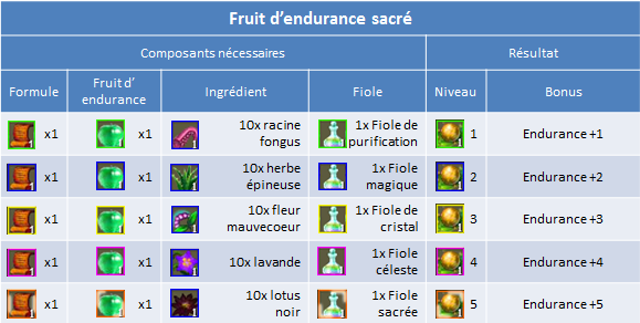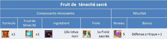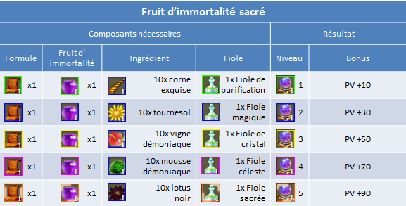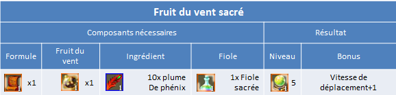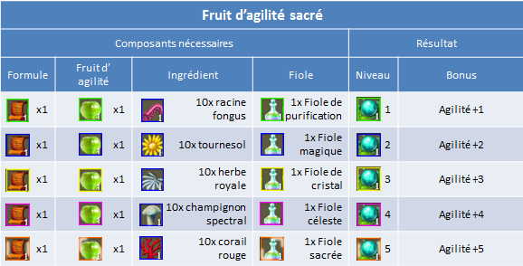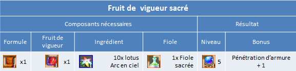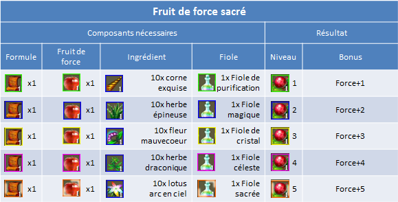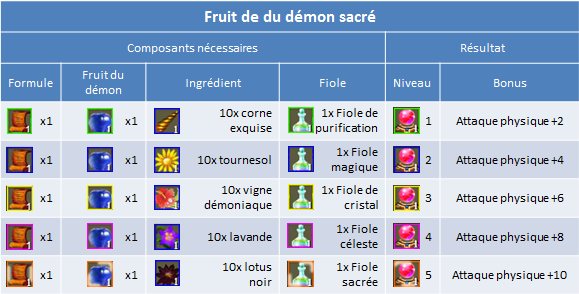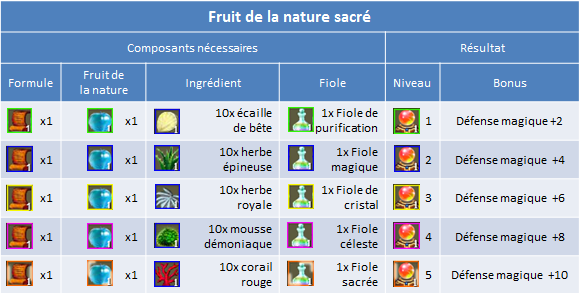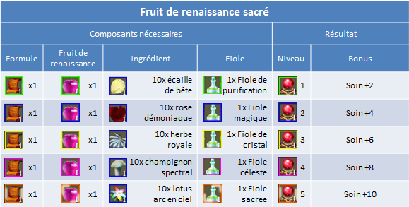 Voici maintenant la description de toutes les formules ainsi que les bonus offert par chaque fruit sacré.