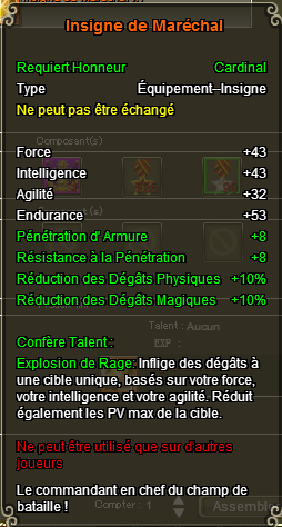 - L'Insigne (qui vous donne +10% de réduction au niveau max pour celle du Maréchal et 11% pour celle d' Arès et la Céleste).