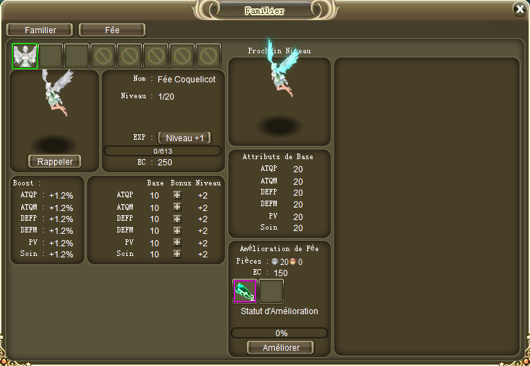 La Fée gagne en expérience à chaque fois que vous tuez des monstres. Son passage de niveau (et non pas à niveau !) doit cependant être validé par vos soins en cliquant sur le bouton Niveau +1. Cela aura pour effet de monter vos statistiques toujours plus. Pour chaque Fée, vous pouvez visualiser les statistiques de base qu'elle confère, mais aussi ceux ajoutés en plus à chaque niveau qu'elle prend. Attention, ces bonus en pourcentages sont calculés sur vos statistiques de base, ne prenant ainsi pas en compte l'âme et autres ajouts.