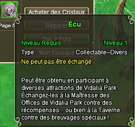En participant aux diverses attractions de Vidalia Park, vous obtiendrez des Écus. Ceux-ci seront échangeables, comme mentionné dans la description, contre des récompenses auprès de la Maîtresse des Offices (Montures et Tenues temporaires 24h) ou bien contre de nouveaux types de "potions" à la Taverne.