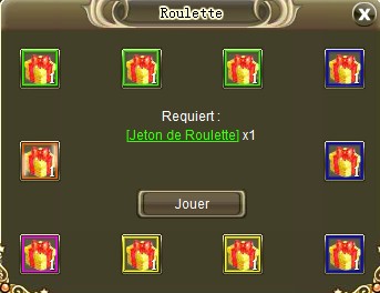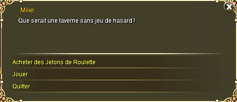 Accessible toute la journée, la Roulette pourra vous permettre de gagner gros ou perdre gros. Pour y jouer, vous aurez besoin de Jetons de Roulette. Un Jeton de Roulette est nécessaire pour la faire tourner une fois et vous coûtera 1 Pièce d'Or. Vous pouvez en acheter par unité, dizaine ou centaine.