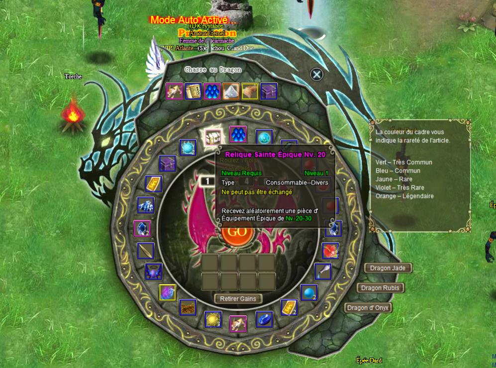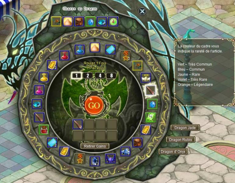 Vous ouvrirez alors une nouvelle fenêtre. Il vous suffira de posséder l'objet correspondant au dragon, de choisir le nombre à utiliser, et de cliquer sur GO. La roue se lancera alors et vous obtiendrez le nombre d'objets correspondant au nombre de Pièces misées. Les objets dépendent bien entendu du tirage.