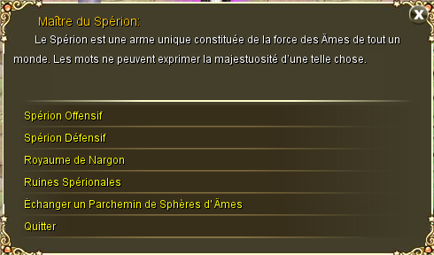 Il donne accès au premier Spérion (donnant des boosts non négligeables), à échanger un Parchemin de Sphère d' Âme, et aussi aux Ruines Spérionales ou au Royaume de Nargon.