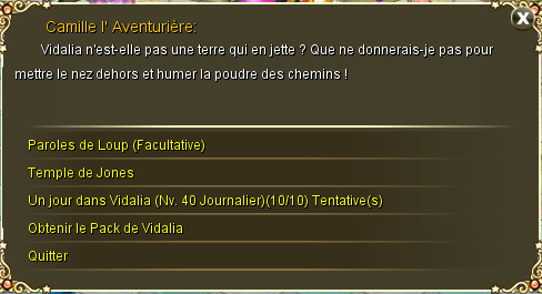 Elle donne l'accès au Temple de Jones, où tuer des monstres peut rapporter des récompenses fascinantes, mais où l'entrée coûte 5 PO. Elle propose aussi les quêtes "Un Jour dans Vidalia" donnant de l'expériance, et au bout de 5 quêtes validées, un pack. Elle donne aussi quelques quêtes facultatives.
