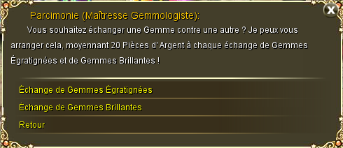 Elle propose d'échanger une Gemme Égratinée ou une Gemme Brillante (de n'importe quelle sorte) contre des Parchemins, mais cet échange coûte 20 PA.