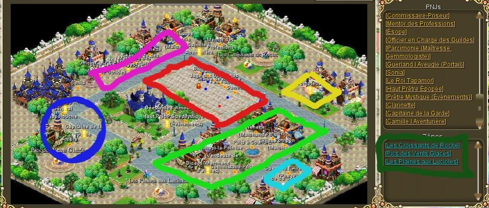 Ces zones de couleur définissent des endroits importants pour des différentes options proposées par des Pnjs.