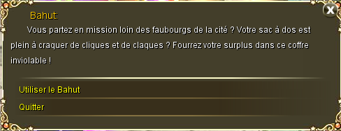 Il permet de stocker les objets en trop dans notre inventaire, pour pouvoir les récupérer plus tard et faire plus de place. On peut aussi y stocker des Familiers. Mais certains objets ne peuvent pas être stockés dedans.