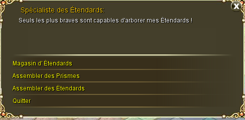 Il propose d'acheter des étendarts (1 Platine), d'assembler des prismes pour améliorer les étendarts.