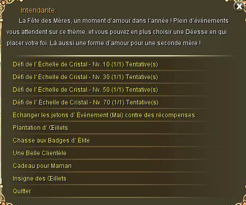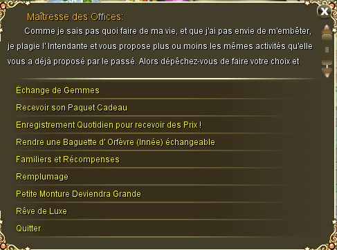 Elle permet l'accès à la récompense quotidienne "Rêve de Luxe" qui propose déchanger 35 jetons d'amélioration de monture et 2 PO contre 1 jeton de luxe d'amélioration de monture. Elle permet d'échanger des Parchemins de Gemmes contre une Gemme (innée) de notre choix. Elle donne accès à la récompense quotidienne "Enregistrement Quotidient pour recevoir des Prix", si vous vous connectez plusieurs jours d'affilée vous obtiendrez des récompenses! Elle permet de taper un code cadeau pour obtenir une récompense si vous avez un code cadeau correct. Si vous possédez une baguette d'orfève (innée), elle peut vous l'échanger contre une baguette d'orfève échangeable. Elle permet d'accéder aux récompenses de Familier: "Familiers et Récompenses", donnant des récompenses si vous arrivez à obtenir un familier grâce à un œuf, ou à le métamorphoser, aux récompenses d' Ailes: "Remplumage", donnant des récompenses si vous arrivez à augmenter vos ailes à de bons niveaux, et finalement aux récompenses de Monture: "Petite Monture deviendra Grande", parvenez à avoir un Ours de Lutte ou mieux pour obtenir d'incroyables récompenses!