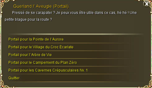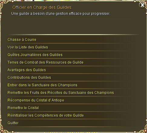 Il donne accès à tous les events des guildes: La Chasse à Courre, les Quêtes Journalières des Guildes, la Bataille des Ressources des Guildes, le Sanctuaire des Champions, le Cristal d'Antiope... Il donne aussi quelques options pour la guilde: "Voir la Liste des Guildes" toutes les guildes y sont, "Avantages des Guildes" permet d'échanger de la Contribution contre des objets utiles, "Contributions des Guildes" permet d'obtenir 2 points de Contribution et une pièce de cuivre pour la guilde en échange d'une pièce d'or, et "Réinitialiser les Compétences de votre Guilde" permet de remettre à zéro les attributs de la guilde.
