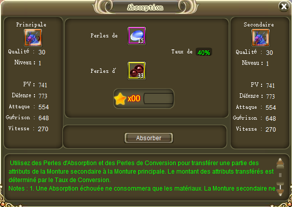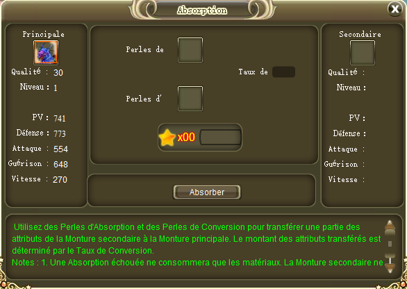 Le système d’absorption vous permet d’améliorer les bonus que vous offre votre monture grâce à l’absorption d’une autre monture. Cela peut vous permettre d’avoir une monture double telle que le Pégase avec plus de bonus qu’un Kilin. Par contre une monture simple ne pourra jamais devenir une monture double. Vous pouvez absorber deux montures complètement différentes, à condition quelles aient le même stade, un nombre illimité de fois. Pour cela il vous suffit de vous rendre dans la fenêtre des montures grâce au bouton