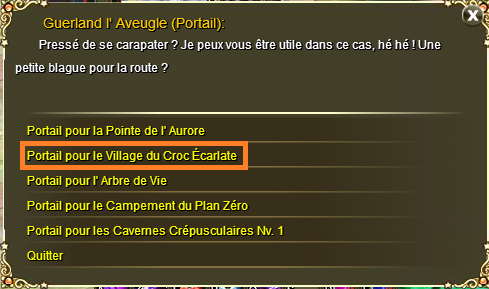 En partant de la Clairière des Étoiles vous avez deux options, vous pouvez marcher vous passez donc par les Plaines aux Lucioles puis vous prenez le bateau à la Baie des Perles ; si vos pieds ou votre monture sont fatigués vous pouvez aller voir Guerland l' Aveugle il vous téléportera directement au Village (40+)