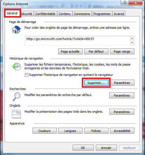 . Allez dans "options internet". De la, allez dans l'onglet "général" si vous n'êtes pas déjà dedans.