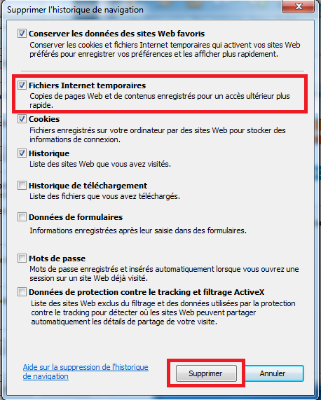 Une nouvelle fenêtre va s'afficher, vérifiez que la phrase "fichier internet temporaire" soit bien cochée. Puis, cliquez de nouveau sur supprimer.