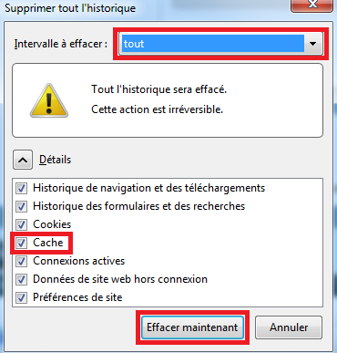Cliquez dessus, puis sur la case "détails". Vérifiez alors que "cache" soit bien coché. Vous pouvez sélectionner à cet endroit une "intervalle à effacer". Pour ma part, je met toujours la plus grande durée possible. Enfin, validez.