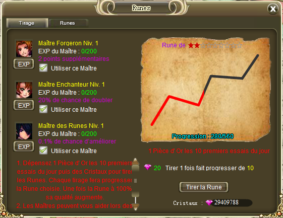 Après avoir choisi une Rune, vous devez donc la faire évoluer. Les dix premiers essais du jour vous coûteront 1 Pièce d'Or et ensuite 20 Cristaux. Chaque tirage donnera 10 points à votre Rune sur sa barre de progression. Une fois à 100%, votre Rune gagne en qualité et offre donc de meilleures statistiques.
