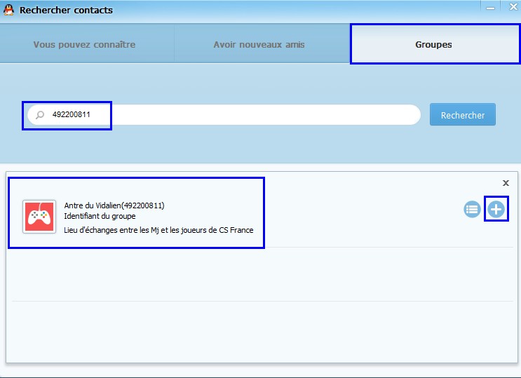 Ensuite, veuillez renseignez le numéro indiqué sur le screen et cliquez sur le + pour ajouter le groupe.