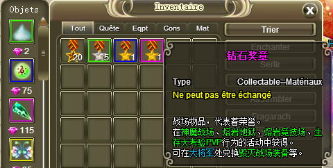 À partir de 50 points obtenus, vous pourrez obtenir des récompenses auprès du Maître de Bataille à la Clairière des Étoiles (l'entrée se fait via lui également). Plus vous en accumulerez et meilleures seront vos récompenses. Badges et Honneur vous attendent ! Alors soyez prêts, et pénétrez dans les Arènes d'Achille !