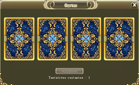 Détails : Pendant la durée de l'événement, accédez à l'événement des Cartes en haut à droite de l'écran pour de magnifiques récompenses, avec une tentative gratuite pour tous chaque jour ! Vous pouvez également acheter des tentatives supplémentaires pour 80 Cristaux. Faites votre choix parmi 4 cartes, et espérez tomber sur cet objet qui vous fait de l'œil !