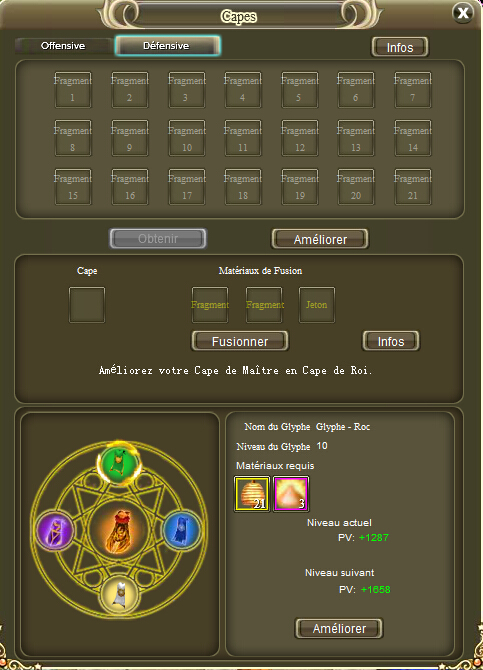 Pour chaque Cape débloquée, vous pouvez activer un Glyphe en bas de l'interface, vous octroyant ainsi des bonus aux stats. Cela requiert quelques matériaux à chaque fois.
