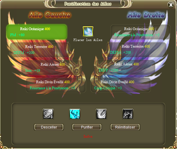Sachez que vous pouvez desceller plusieurs types de Reiki grâce à vos ailes. 4 types existent et devront être débloqués de gauche à droite. Des bonus de stats aléatoires seront octroyés pour chaque partie de l'aile descellée et s'ils sont identiques pour le même type de Reiki, vous obtiendrez le Talent associé à ce Reiki.