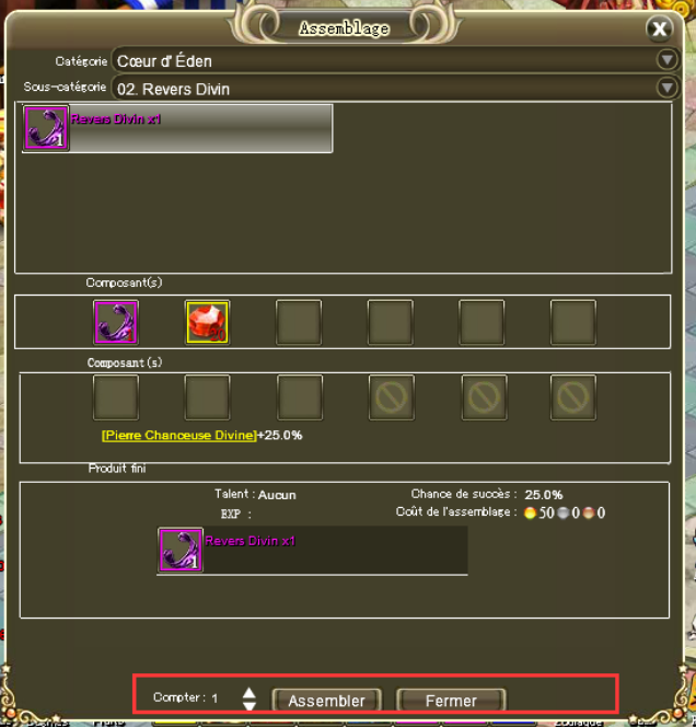 La Maîtresse des Revers Divins, située dans la Clairière des Étoiles, peut vous aider à synthétiser un Revers Divin. Pour ce faire, vous aurez besoin d'un Cœur d’Éden et d'Amarante Divine (trouvable dans la Boutique).