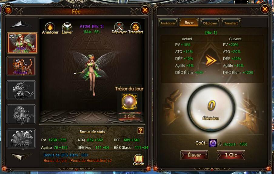 - L'amélioration : cette fonction vous permet de booster les stats de votre personnage. Il suffit pour ça de donner des Fioles Féeriques à vos Fées.