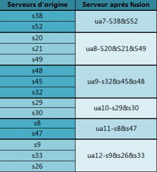 Afin de vous offrir à tous une meilleure expérience de jeu, nous avons décidé de fusionner certains serveurs. Après avoir évalué la situation, nous avons décidé de fusionner les serveurs listés ci-dessous le 17 novembre à 3 heures du matin (heure du serveur). Ceux-ci seront inaccessibles pendant environ 2 heures.