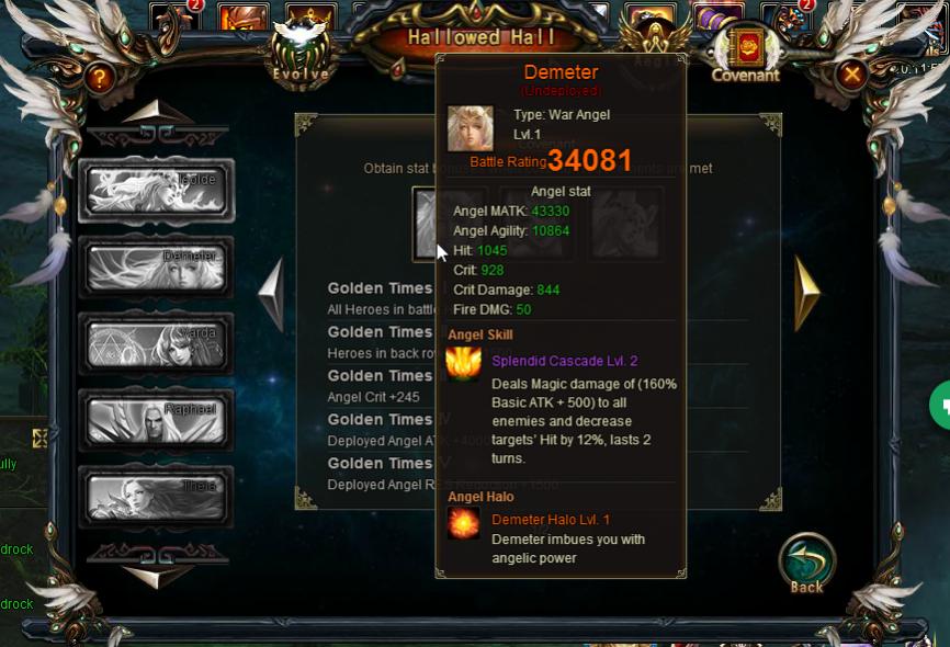 Angel Skill: Deals Magic damage (160% ATK + 500) to all enemies and decreases targets' Agility by 8%, lasts 2 turns.