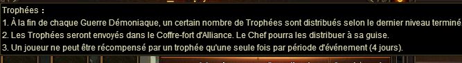 bonjour, les trophes sont disctribuer par le chef d'alliance aux joueurs qui ont au moins contribuer de 10000 comme dons minmium, une fois tout les 4 jours