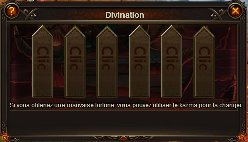 Si vous avez eu un mauvais tirage, il vous est possible de corriger celui ci en payant 30 diamants. Pour cela, cliquez sur Karma.
