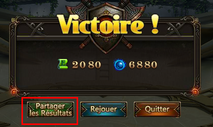 Entrez dans un combat. Une fois celui-ci terminé, cliquez sur le bouton « Partager les Résultats » (encadré en rouge) qui s’affiche dans la fenêtre de victoire/défaite, comme indiqué dans la capture d’écran ci-dessous.