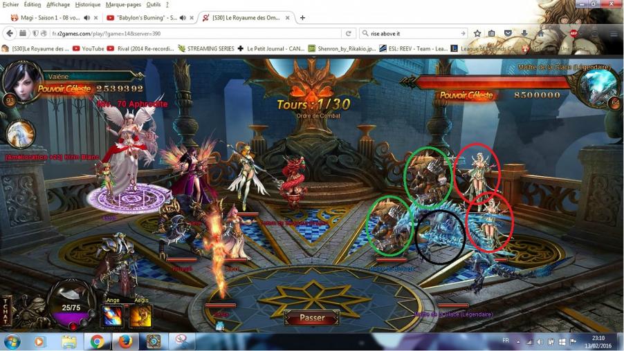 Coup de chance, on observe que dès le départ, lumière des arcanes et tempête de flammes font mouche. Les soigneurs sont étourdis et seront inactifs jusqu'au tour 3. Pour Valérie qui possède 412k d'ATQ, la victoire est dès lors quasiment certaine. Bravo Valounette.