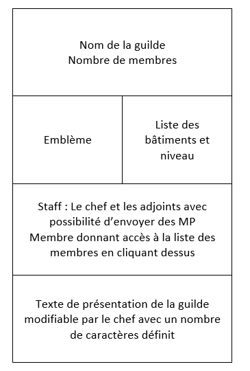 Un descriptif de la guilde rédigé par le chef et visible par les hors guilde serait une bonne façon de connaître celle ci et visible quand on va voir la composition d'une guilde.