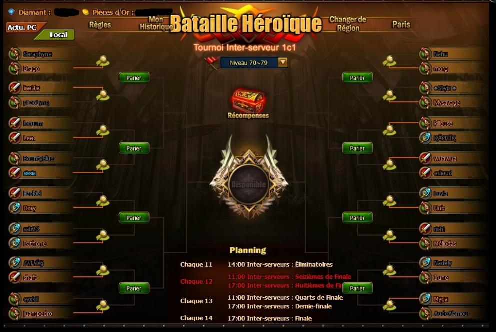 Soit un total de 12 guildes inscrites. Il y aura donc des guildes qui passeront le premier tour sans avoir de combat sur ce tournoi à 4 tours (16-8-4-2-1)